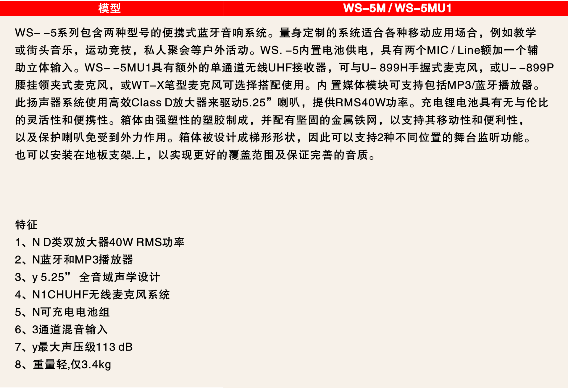 WS-5系列包含两种型号的便携式蓝牙音响系统。量身定制的系统适合各种移动应用场合,例如教学或街头音乐,运动竞技,私人聚会等户外活动。WS-5内置电池供电,具有两个MIC / Line额加一个辅助立体输入。WS- -5MU1具有额外的单通道无线UHF接收器,可与U- 899H手握式麦克风,或U-899P腰挂领夹式麦克风,或WT-X笔型麦克风可选择搭配使用。内 置媒体模块可支持包括MP3/蓝牙播放器。此扬声器系统使用高效Class D放大器来驱动5.25”喇叭,提供RMS40W功率。充电锂电池具有无与伦比的灵活性和便携性。箱体由强塑性的塑胶制成,并配有坚固的金属铁网,以支持其移动性和便利性,以及保护喇叭免受到外力作用。箱体被设计成梯形形状,因此可以支持2种不同位置的舞台监听功能。也可以安装在地板支架.上,以实现更好的覆盖范围及保证完善的音质。