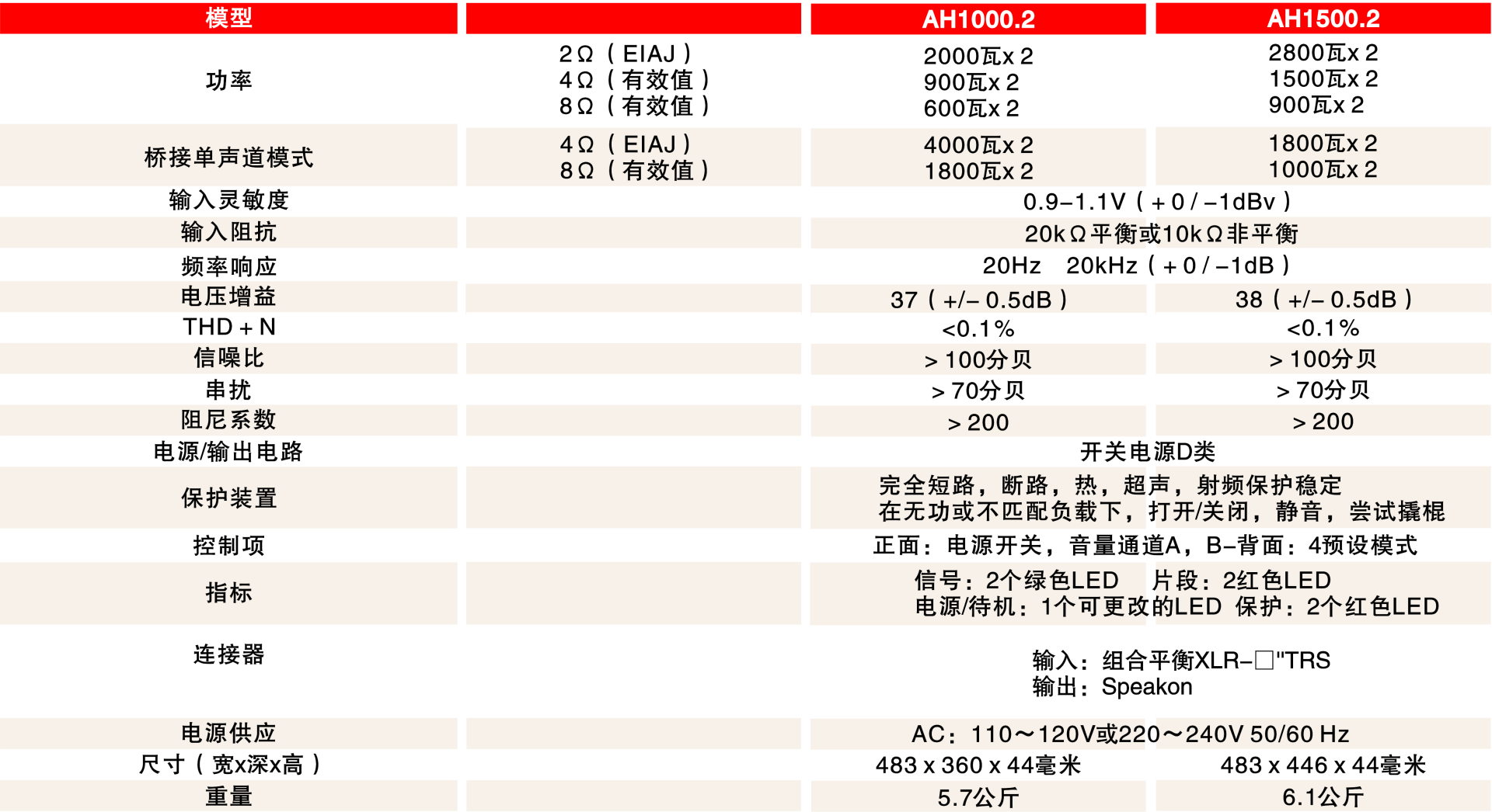 AH1000.2和AH1500.2提供低阻抗和高电压输出。它们分别提供900W和1500W / 4Ω的功率,可以用作在各种工作模式下驱动大型扬声器系统的强大信号源。两种型号均具有D类放大功能,可提供高功率效率,并减少了噪声和失真。它们还可以驱动2Ω负载。在桥接模式下,AH1500.2的输出功率为2800W /4Ω。内置的交叉滤波器可以针对50Hz至250Hz的截止频率进行调整。4个Dip开关选择预设模式,如立体声,并行,单声道桥和70V / 100V。 AH1000.2和AH1500.2提供低阻抗和高电压输出。它们分别提供900W和1500W / 4Ω的功率,可以用作在各种工作模式下驱动大型扬声器系统的强大信号源。两种型号均具有D类放大功能,可提供高功率效率,并减少了噪声和失真。它们还可以驱动2Ω负载。在桥接模式下,AH1500.2的输出功率为2800W /4Ω。内置的交叉滤波器可以针对50Hz至250Hz的截止频率进行调整。4个Dip开关选择预设模式,如立体声,并行,单声道桥和70V / 100V。 AH1000.2和AH1500.2提供低阻抗和高电压输出。它们分别提供900W和1500W / 4Ω的功率,可以用作在各种工作模式下驱动大型扬声器系统的强大信号源。两种型号均具有D类放大功能,可提供高功率效率,并减少了噪声和失真。它们还可以驱动2Ω负载。在桥接模式下,AH1500.2的输出功率为2800W /4Ω。内置的交叉滤波器可以针对50Hz至250Hz的截止频率进行调整。4个Dip开关选择预设模式,如立体声,并行,单声道桥和70V / 100V。