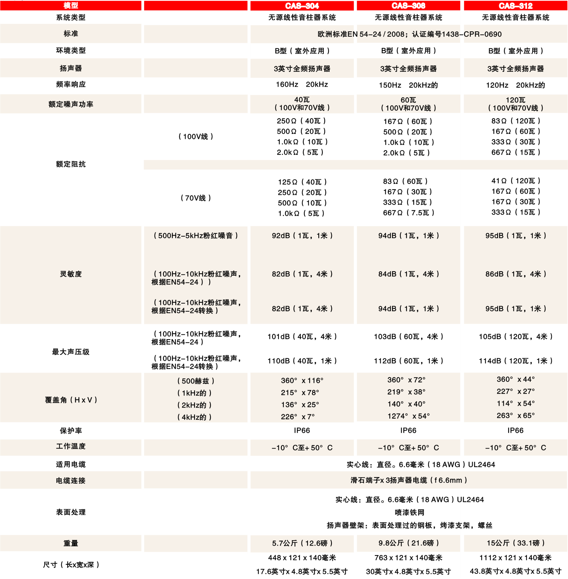CAS系列音柱具有音质清晰和自然音乐高度重现特点,是教堂,空间建筑,礼 堂,火车站,露天广场和其他交通枢纽等高度混响环境的完美解决方案。基于 线阵列原理,具备宽广的辐射范围和出色的远距离声音投射。CAS系列箱体为 铝合金材质,设计于室外应用。配备3英吋全频带扬声器,分别包括4/8/12个扬 声器。波段开关使多功率选择更加便捷。所有型号均通过IP66防水等级和EN54 -24认证。